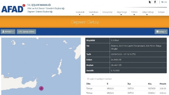 Afet ve Acil Durum Yönetim Başkanlığı (AFAD) Deprem Dairesi Başkanlığı tarafından yapılan açıklamaya göre, Datça ilçesi açıklarında 5.3 büyüklüğünde deprem meydana geldi. Deprem, Datça'nın 203.79 kilometre açığında saat 07.13 sıralarında 6.76 kilometre derinlikte gerçekleşti. AFAD tarafından depremde herhangi bir olumsuzluk yaşanmadığı bildirildi.