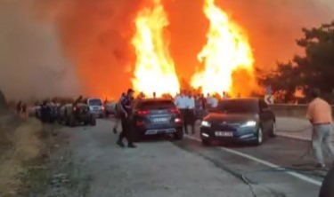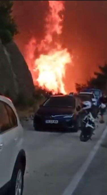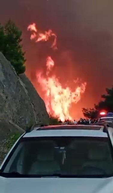 Hızla ilerleyen alevlerden kurtulmak için karayolunda koşarak kaçan vatandaşların panik anları kameralara anbean yansıdı.