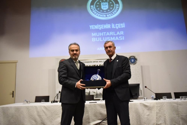 Yenişehir Muhtarlar Derneği Başkanı Orhan Yıldız da mahallelerine kazandırılan hizmetler sebebiyle Başkan Aktaş’a teşekkür etti. Yıldız, Başkan Aktaş’a ilçe muhtarları adına çini sürahi ve duvar saati hediye etti.