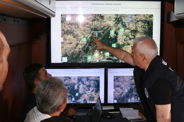 Bursa’nın Harmancık ilçesindeki yangın akşam saatlerinde yeniden alevlenirken, Bursa Büyükşehir Belediyesi itfaiye teşkilatı başta olmak üzere Orman Bölge Müdürlüğü, kamu kurumları, büyükşehir belediyeleri, ilçe belediyeleri, sivil toplum kuruluşları ve vatandaşların iş birliğiyle söndürme çalışmaları aralıksız sürdürülüyor. Bursa Büyükşehir Belediye Başkanı Mustafa Bozbey de beraberindeki CHP İl Başkanı Nihat Yeşiltaş, CHP Bursa Milletvekili Hasan Öztürk ve belediye yöneticileriyle birlikte Harmancık ilçesine geçerek çalışmaları yerinde inceledi. Sahada gece gündüz demeden görev alan ekiplere kolaylıklar dileyen Başkan Bozbey, AKOM aracına geçerek drone aracılığıyla alanı gözlemledi ve son durum hakkında bilgi aldı.