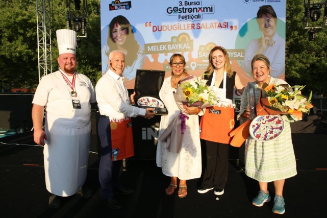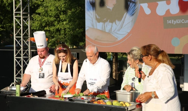 Festival çerçevesinde ilçe belediyelerinin açtığı stantları gezerek yöresel ürünlerini inceleyen Başkan Mustafa Bozbey ve eşi Seden Bozbey, daha sonra Prof. Dr. Gül Sayan Atanur moderatörlüğünde Nebil Özgentürk ile ‘Bursa’nın Tarihi Kültür Mirası ve Gastronomisi’ söyleşine katıldı. Alanda kurulan ana sahnede Sahrap Soysal ve Melek Baykal’ın sunduğu ‘Gastro Sahne’ye konuk olan Başkan Bozbey ve eşi Seden Bozbey, mutfak önlüğünü takıp Bursa’nın coğrafi tescilli ürünlerini kullanarak ‘Bursa dudugiller salatası’ hazırladı. Şef Ali Müfit Çağlayan’ın yönlendirmesiyle ürünleri işleyen Başkan Bozbey, Bursa’nın sahip olduğu tatların tümünü önce Bursalıların, sonra tüm Türkiye’nin bileceğini söyledi. Sahrap Soysal ve Melek Baykal’ın yüksek enerjisiyle keyifli anlar yaşayan katılımcılar, Başkan Bozbey’in mutfaktaki hünerlerini de izledi. Hazırlanan salatanın tadına bakan Başkan Bozbey ve eşi Seden Bozbey, meyve ve sebzelerle yapılan salatayı Bursalılara da tavsiye etti. Program sonunda Başkan Bozbey ve konuklar, sahnede ‘Ayva Çiçek Açmış’ şarkısı eşliğinde oynadı.