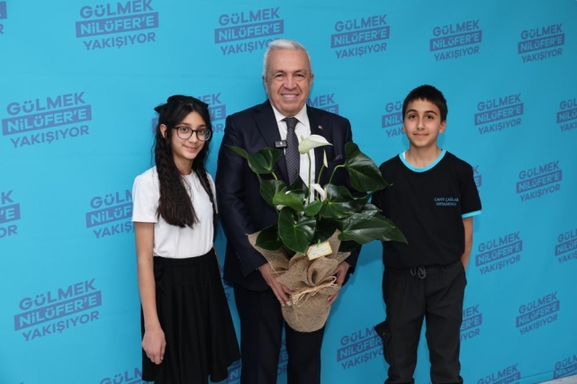 Nilüfer Cavit Çağlar Ortaokulu 7’nci sınıf öğrencileri Celal Aras Erten, arkadaşları Zeynep Nehir Kesen ve Hüsnü Mete Özcan, Müdür Yardımcısı Ali Zafer Şencan, Türkçe Öğretmeni Deniz Dilek Toroslu ile birlikte Nilüfer Belediye Başkanı Şadi Özdemir’i Halk Evi’ndeki makamında ziyaret ettiler. Başkan Şadi Özdemir, 23 Nisan Ulusal Egemenlik ve Çocuk Bayramı nedeniyle temsili olarak koltuğunu Celal Aras Erten’e devretti. Makama geçen çocuk Başkan, bazı konularda talimatlar verdi.