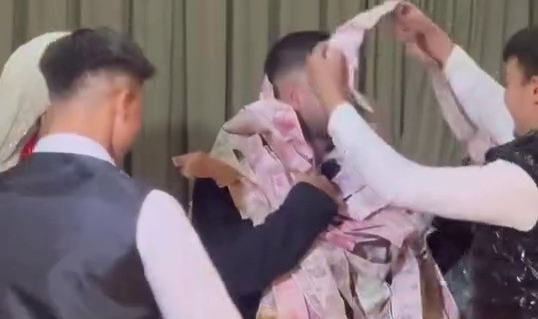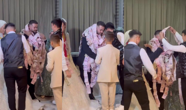 Bursa’da düzenlenen bir düğünde ilginç görüntüler yaşandı. Beyda ve Enes çiftinin mutlu gününde takı merasiminde salona getirilen metrelerce uzayan para şeridi davetlilerin dikkatini çekti. Davetliler arasında şaşkın bakışlar olurken, bazı misafirler telefonlarına sarılarak o anları kayda aldı. 50 metre boyunca uzanan para şeridinin damadın üzerine tek tek dolanması renkli görüntülere sahne oldu.