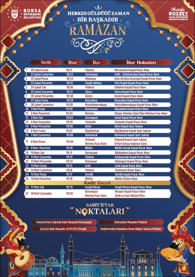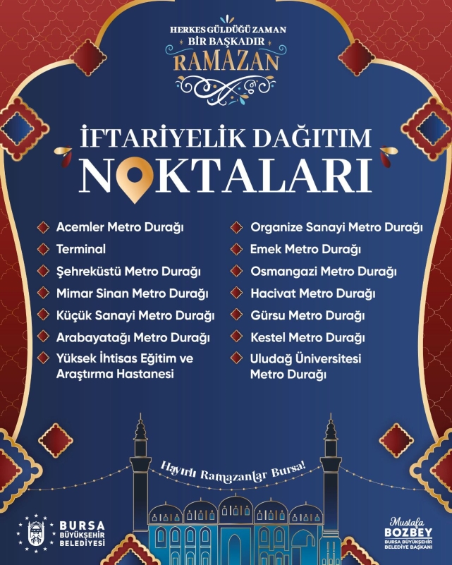 Büyükşehir Belediyesi Bu kapsamda; Osmangazi’de Fomara Fevzi Çakmak Katlı Otoparkı, Yıldırım’de Emirsultan Meydanı ve Değirmenönü Mahallesi Elvan Düğün Salonu ile İnegöl’de Çarşı İçi Alan Otoparkı (BURPARK) olmak üzere toplam 4 sabit iftar noktasında vatandaşları ağırlıyacak.