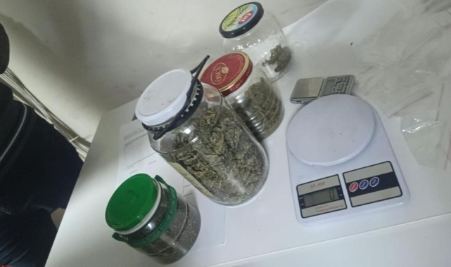 Evde yapılan aramalarda; 2 adet ruhsatsız tabanca, 67 adet fişek, 5 parça halinde toplam 728 gram esrar, 9 parça halinde 146 gram esrar tohumu, 2 kök hint keneviri, 86 adet şeffaf kilitli poşet, 1 adet havalı tüfek ve 2 adet hassas terazi ele geçirildi.