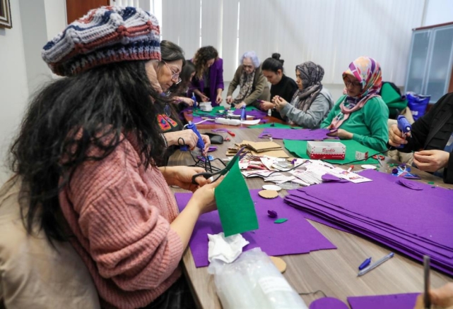 Bursa Kent Konseyi Kadın Meclisi’nde gerçekleştirilen atölye çalışmasında, keçe kumaşlar, renkli iplikler, düğmeler ve süsleme malzemeleri kullanılarak birbirinden renkli ürünler hazırlandı.