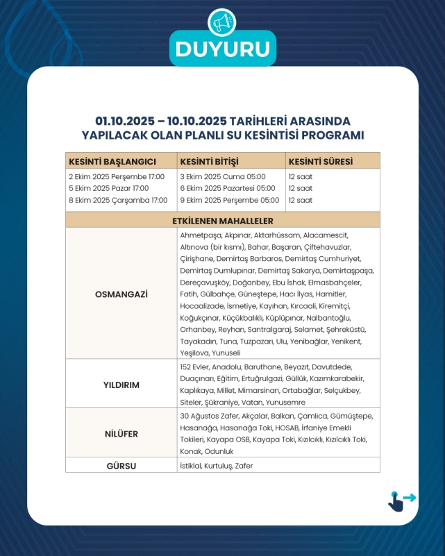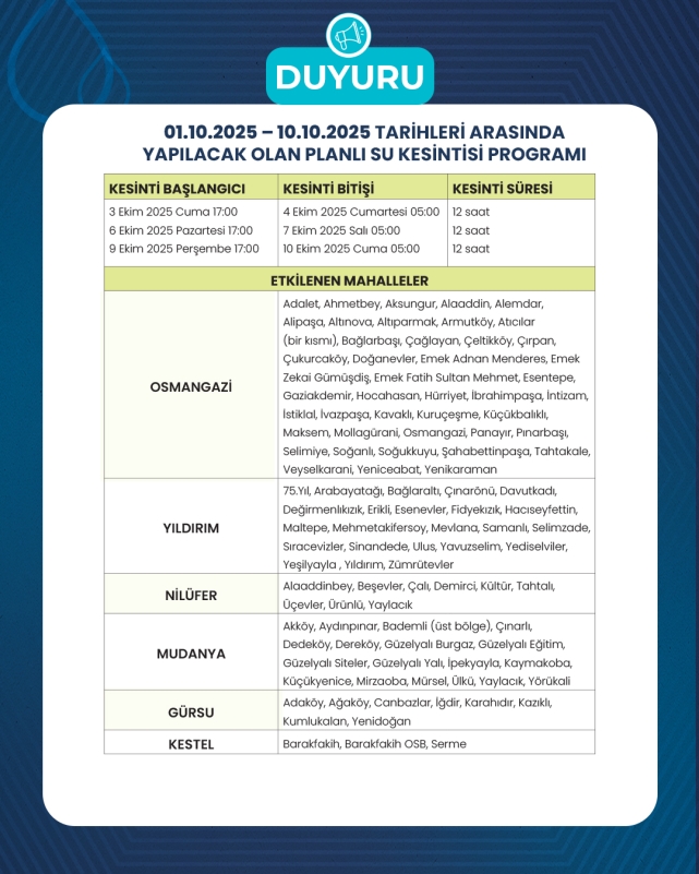 Söz konusu planlı su kesintileri, günlük 12 saati geçmemek kaydıyla, merkez ilçelere bağlı mahallelerde dönüşümlü olarak uygulanacaktır. Yapılması planlanan su kesintileri ile günlük 100 bin metreküp su tasarrufu yapılması hedeflenmektedir. Yağmurların yağması akabinde barajlarımızda yeterli miktarda su rezervi oluştuğu takdirde kesintiler sona erdirilecektir. İdaremiz tarafından sağlanan içme suyunun kalitesi 24 saat boyunca izlenmekte olup sağladığımız suyun güvenle tüketilmesinde herhangi bir sakınca bulunmamaktadır.Planlı su kesintilerinden, Uludağ Üniversitesi, Şehir Hastanesi ve Devlet Hastaneleri etkilenmeyecektir. Planlı su kesinti listesi ekte sunulmuştur” denildi.