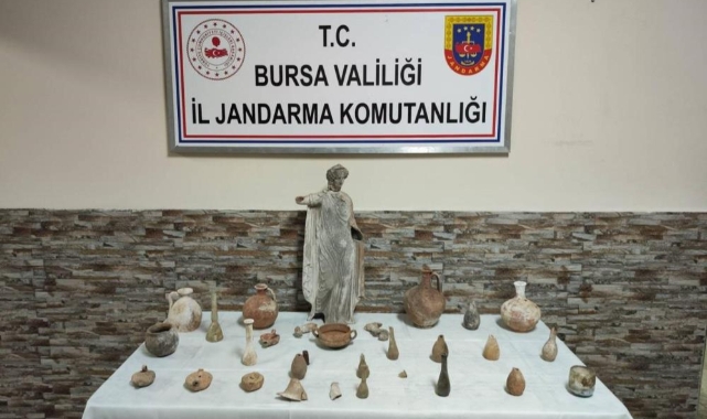 Nilüfer’de jandarma ekiplerinin düzenlediği operasyonda Roma ve Bizans dönemlerine ait olduğu değerlendirilen 29 obje ve 60 santimetre uzunluğunda bir heykel ile el dedektörü ele geçirildi.