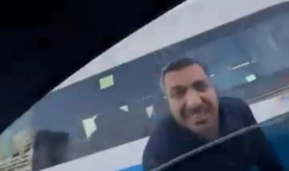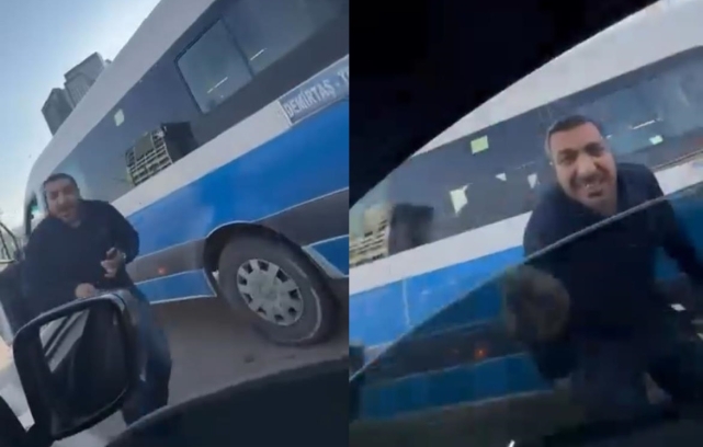 Otomobilde bulunan bir yolcu tarafından cep telefonu kamerasıyla kaydedilen görüntülerde, sürücünün öfkeyle araca saldırdığı anlar yer aldı.