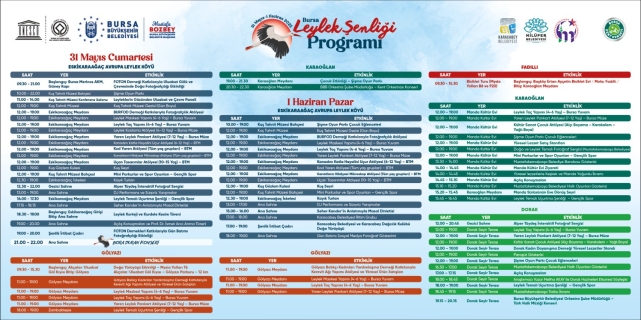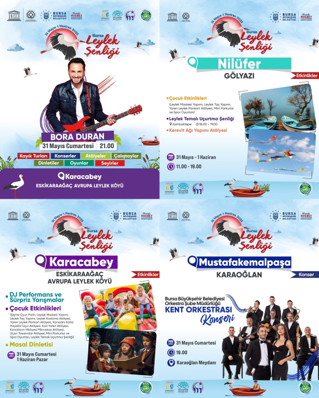 Etkinlikler kapsamında 5 mahallede çocukların doyasıya eğlenebileceği oyun parkları, sürpriz yarışmalar, uçurtma şenliği, masal, atölyeler düzenlenirken, her yaştan insanın katılabileceği çalıştaylar, fotoğraf sergileri, geziler, gösteriler, konserler, kayık turları, söyleşiler, doğa yürüyüşleri, bisiklet turları da şenlik kapsamında yer alıyor. Şenlik hakkında detaylı bilgi için https://www.bursa.bel.tr/etkinlik/bursa-leylek-senligi-1244 adresi ziyaret edilebilir.