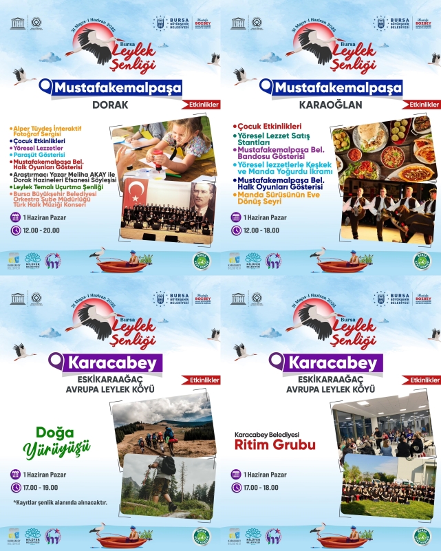 Etkinlikler kapsamında 5 mahallede çocukların doyasıya eğlenebileceği oyun parkları, sürpriz yarışmalar, uçurtma şenliği, masal, atölyeler düzenlenirken, her yaştan insanın katılabileceği çalıştaylar, fotoğraf sergileri, geziler, gösteriler, konserler, kayık turları, söyleşiler, doğa yürüyüşleri, bisiklet turları da şenlik kapsamında yer alıyor. Şenlik hakkında detaylı bilgi için https://www.bursa.bel.tr/etkinlik/bursa-leylek-senligi-1244 adresi ziyaret edilebilir.Nilüfer Belediye Başkanlığı döneminde, sorumluluk alanlarında olmamasına rağmen birçok kurumun desteğiyle ‘Leylek Dostu Köy' projesini başlattıklarını hatırlatan Başkan Mustafa Bozbey, projenin şimdi ‘Bursa Leylek Şenliği' adıyla daha kapsamlı bir şekilde organize edildiğini belirtti. İki gün sürecek olan şenlikte, yediden yetmişe herkesin ilgi duyacağı programlar hazırlandığını ifade Başkan Bozbey, "Köyümüzün daha fazla ziyaretçi çekebilmesi için tanıtım ve yatırım çalışmalarını sürdürüyoruz. Misafirlerimiz için çeşitli tesis ve alanlar planlıyoruz. Yapacağımız çalışmalarla Leylek Köyü'nü hak ettiği şekilde Bursamıza kazandıracağız. Bursa Leylek Şenliği'ni Uluabat Gölü'ne kıyısı olan Eskikaraağaç, Fadıllı, Gölyazı, Karaoğlan ve Dorak mahallelerinde gerçekleştireceğiz. Halkımızın şenliğe rahat katılabilmesi için BURULAŞ aracılığıyla ücretsiz otobüs seferleri de düzenliyoruz. Tüm Bursalıları şenliğimize bekliyoruz" dedi.