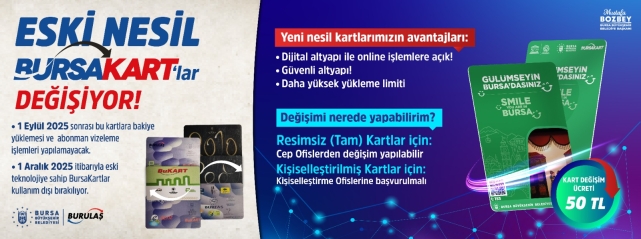 2002 yılında kullanıma giren birinci nesil BursaKartlar, yeni nesil kartlarla değiştiriliyor. Eski nesil kartların yükleme ve dolum süresi 1 Ekim 2025 tarihine kadar uzatılırken, dolum ve yükleme işlemleri yalnızca kiosk cihazları üzerinden gerçekleştirilecek. Teknolojik ömrünü yitirmiş, dijital alt yapı desteği bulunmayan, BursaKart mobil uygulamasıyla uyumsuz, kayıp kart durumunda bakiyenin aktarılamamasının yanı sıra güvenlik zafiyetleri oluşturan kartlar, 1 Ekim itibariyle dolum ve yüklemeye, 31 Kasım’da ise kullanıma kapatılacak.