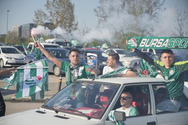 Acemler İstasyonu Otoparkı'na kurulan dev ekranda maçı izleyen taraftarlar, nefesleri tutarak maç düdüğünün çalmasını bekledi. Müsabakanın bitmesinin ardından meşaleleri yakan Bursasporlu taraftarlar, şampiyonluğu coşkuyla kutladı.