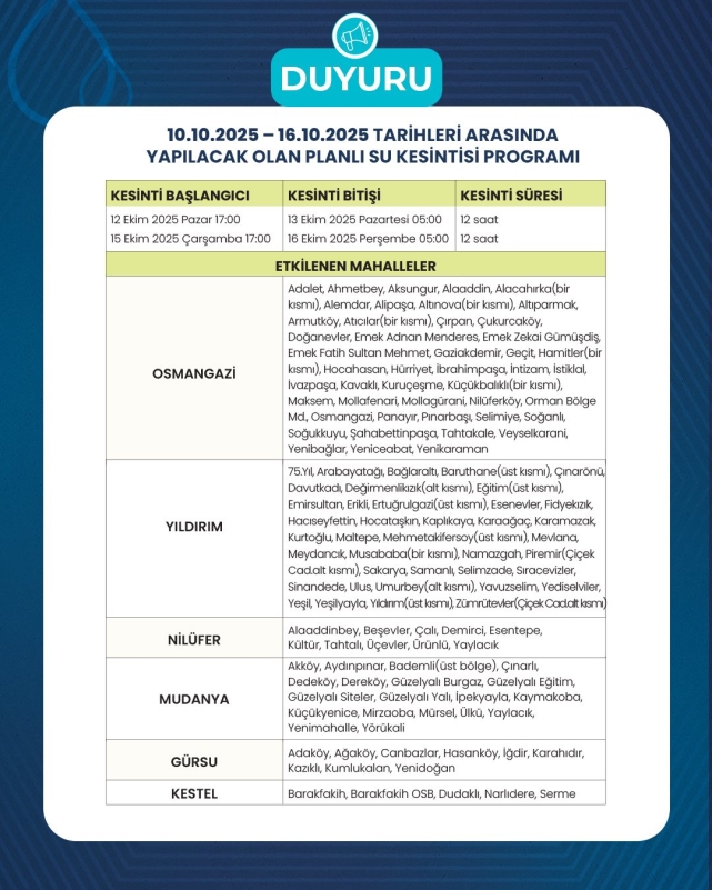 BURSA Yayınlanma: 10 Ekim 2025 - 10:00 BUSKİ'den planlı su kesintileri BUSKİ Genel Müdürlüğü, iklim değişikliği neticesinde ortaya çıkan kuraklık sonucu su kaynaklarının azalması ve baraj doluluk oranlarının kritik seviyeye düşmesi sebebiyle 10 Ekim-16 Ekim tarihleri arasındaki yapacağı su kesintilerini duyurdu. BURSA 10 Ekim 2025 - 10:00 TAKİP ET Yazdır A Büyüt A Küçült Yorumlar YORUMLAR FACEBOOK adlı kullanıcıya cevap x Gönder İlginizi Çekebilir Nilüfer'de su kesintisi Yıldırım Belediyesi'nden 5 bin 867 tapu İnegöl Belediyesi’nden 3 bölgede asfalt hamlesi Sındırgı'da deprem! Son Haberler MSB: TSK'ya ait kargo uçağı düştü Bursalı çiftçinin yüzü gülüyor Nilüfer'de su kesintisi 8. kattan düşen genç adam hayatını kaybetti Bursa'nın ruhu notaya döküldü Gemlik'te ruhsatsız silah imalatına 4 gözaltı Gemlik'te ruhsatsız silah imalatına 4 gözaltı