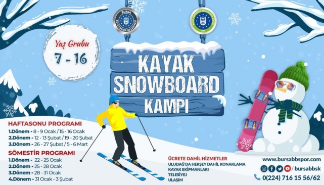 Hafta sonu ve 4’er günlük sömestre olmak üzere 2 ayrı programla gerçekleştirilecek kayak-snowboard kamplarında çocuklar hem kayak sporuyla tanışacak, hem de keyifli zaman geçirme imkânı bulacak. 7-16 yaş aralığındaki çocukların katılacağı eğitimler hafta sonu grubunda 3 dönem, sömestre grubunda ise 4 dönem halinde düzenlenecek. Kayak-snowboard kamplarında hafta sonu eğitimleri ilk dönem 8-9 ve 15-16 Ocak 2022, ikinci dönem 12-13 ve 19-20 Şubat 2022 ile üçüncü dönem 26-27 Şubat ve 5-6 Mart 2022 tarihlerinde verilecek. Sömestre eğitimlerinde ise 22-25 Ocak 2022, ikinci dönem 25-28 Ocak 2022, üçüncü dönem 28-31 Ocak 2022 ve dördüncü dönem ise 31 Ocak-3 Şubat 2022 tarihleri arasında gerçekleştirilecek. Kayak-snowboard kampı kayıtları Hüdavendigâr Kent Parkı’nda yer alan Bursa Büyükşehir Belediyespor Kulübü binasında yapılacak.