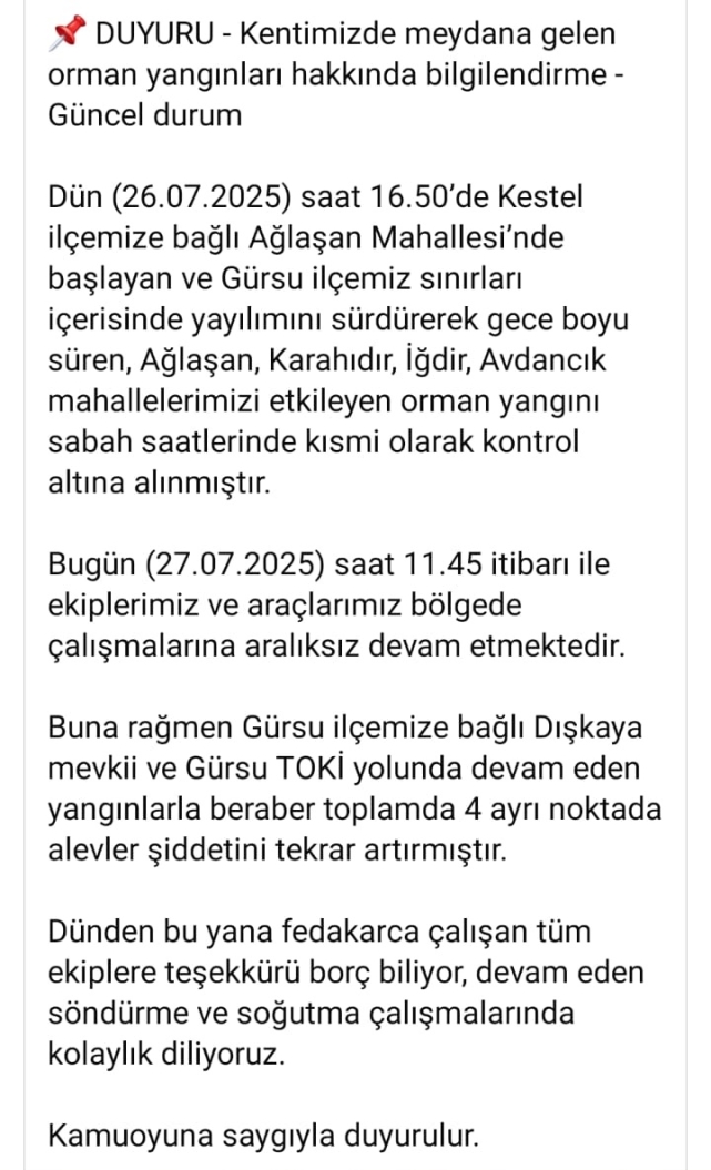 Bursa Büyükşehir Belediyesi yaptığı yazılı açıklamada; ''Dün Kestel ilçemize bağlı Ağlaşan Mahallesi'nde başlayıp Gürsu İlçesi sınırları içerisinde yayılımı sürdürerek gece boyu Ağlaşan, Karahıdır, İğdir ve Avdancık Mahallelerini etkileyen Orman yangınları kısmen kontrol altına alınmıştır.