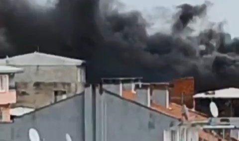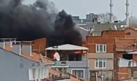 Çatının alev alev yanma anları cep telefon kamerasına yansıdı.Yangının çıkış sebebi araştırılıyor.