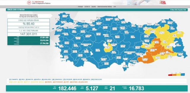 Buna göre, Türkiye'de son 24 saatte 182 bin 446 Kovid-19 testi yapıldı, 5 bin 127 kişinin testi pozitif çıktı, 21 kişi yaşamını yitirdi, iyileşenlerin sayısı 16 bin 783 oldu.