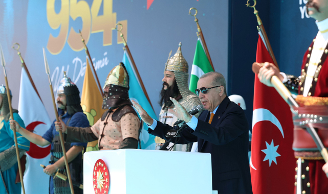 Malazgirt Zaferi’nin 954. yıl dönümü kutlamalarına katılmak üzere dün geldiği Bitlis’in Ahlat ilçesinde geceyi geçiren Cumhurbaşkanı Erdoğan, beraberindeki MHP Lideri Devlet Bahçeli ve bakanlarla öğle saatlerine doğru Muş’un Malazgirt ilçesine geldi. Burada toplanan kalabalığa hitap eden Erdoğan, "Sevgili Muşlu kardeşlerim, ülkemin dört bir yanından şu anda Malazgirt’te bir araya gelen kardeşlerim, Milliyetçi Hareket Partisi’nin Genel Başkanı Sayın Devlet Bahçeli, siyasi partilerimizin saygıdeğer genel başkanları, yarınlarımızın teminatı sevgili gençler, kıymetli hanımefendiler, değerli misafirler, sizleri en kalbi duygularımla, hürmetle, muhabbetle selamlıyorum. Sizlerin şahsında Hakkari’den Edirne’ye, Muğla’dan Kars’a, Hatay’dan Sinop’a 81 ilimizdeki 86 milyon vatandaşımızın tamamına selamlarımı sevgilerimi gönderiyorum. Yine buradan İsrail’in barbar saldırıları altında hayat ve haysiyet mücadelesi veren Gazzeli, Filistinli kardeşlerimizi selamlıyor. Kendilerine dayanışma mesajlarımızı iletiyorum. Dün Ahlat’ta gençlerimizle hasret giderdik. Kubbetül İslam’ın o ferah ve vakur iklimini doya doya teneffüs ettik. Ardından kabine toplantımızı Cumhurbaşkanlığı Ahlat Külliyemizde gerçekleştirdik. Akabinde milletimize yine Ahlat’tan seslendik. Bugün de sizlerle birlikte o müstesna zaferin 954. yıl döneminde Malazgirt’teyiz. Bu meydanı hıncahınç doldurarak heyecanımıza ortak olan siz kıymetli kardeşlerime ayrı ayrı teşekkür ediyorum" dedi."Gençler, dünyaya biz buradayız ve kıyamete kadar da burada olacağız mesajını en güçlü şekilde verdiğimiz Malazgirt Zaferi’nin 954. yılı mübarek olsun" diyen Erdoğan, konuşmasını şöyle sürdürdü:"Büyük komutan Sultan Alparslan ve yiğit askerlerinin, gazilerin, akıncı birliklerinin, o kahraman ordunun, her bir neferinin, aziz ruhları şad olsun. Kıymetli kardeşlerim, zaferin müjdecisi olan o kutlu gündü. İslam coğrafyasının dört bir ucundaki camilerde, minberlerde şu hutbe irade ediliyordu. ‘Allah’ım, İslam’ın sancağını yükselt ve Alparslan’a yardım et. Onun niyet ve azmini başarıyla neticelendir. O nasıl senin çağrına uyup dininin korunmasını rehavet göstermeden emrine uymuş ve düşmanlarına bizzat karşı koyarak geceyi gündüze katmışsa sen de ona zafer kısmet eyle. Dileklerinde ona yardımcı ol. Kaza ve kaderini onun için tecelli ettir.’ Sultan Ertuğrul’dan 26 Ağustos cuma namazını eda ettikten sonra kefen niyetine giydiği beyaz elbisesiyle ordusunun huzuruna çıkmış ve gaza erlerine şu tesirli sözlerle hitap etmişti. Gençler, burayı iyi dinleyin. ‘Ey askerlerim ve komutanlarım daha ne zamana kadar biz azınlıkta, düşman çoğunlukta olmak üzere böyle bekleyeceğiz. Ben bizzat Müslümanların minberlerde bizim için dua ettikleri bu saatte düşmanın üzerine atılmak istiyorum. Galip gelirsek arzu ettiğimiz sonuç hasıl olacaktır. Aksi takdirde şehit olarak cennete gideceğiz.’ Evet. Atının kuyruğunu bağlayıp düşmanın üstüne korkusuzca atılan Sultan Alparslan ve ordusunu bugün bir kez daha kemal-i hürmetle yad ediyoruz. Ahlat ve Malazgirt önlerindeki ilk akınlardan fethin ilk günlerinden bugüne vatan için, bayrak için, millet ve ümmet için canlarını feda eden şehit ve gazilerimizin tamamına Cenabı Allah’tan rahmet niyaz ediyor.""954 yıl önce Malazgirt Ovası’nda yazılan kahramanlık destanından aldığımız cesaret ve öz güvenle istikbale yürüyoruz"Malazgirt’te düşmanı bozguna uğratan, Anadolu’nun cümle kapısını ardına kadar açan o gücün bugün burada olduğunu ifade eden Erdoğan, "Şu anda Malazgirt’teki gazilerin Allah adına and içtikleri minberin önünde ve Allah’a yükselen ellerin üstünde minberdeki yeşil perdenin harp meydanlarından gelen rüzgârla kabardığını adeta görüp gibiyim. Ben bugün Nurettin Topçu üstadımızın işte bu sözlerle tarif ettiği o güçlü ruh bugün hamd olsun Malazgirt meydanındadır. Malazgirt’te omuz omuza destan yazan kahramanların uğruna hayatlarını feda ettikleri mukaddes değerler işte buradadır. Türk’üyle, Kürt’üyle, Arap’ıyla, Sünni’si ve Alevisi’yle Anadolu’nun gönül harcını muhabbetle yoğuran kurucu irade bugün buradadır. Asırlar boyunca yeryüzüne nizam vermiş İlah-ı Kelimetullah’ı bu davayı müdafaa etmiş. O sarsılmaz inanç bugün ham olsun buradadır. Şunu özellikle ifade etmek istiyorum. Sultan Artuklu’nun zaferini Selahaddin-i Eyyubi ve ordusu ile buluşturan, Sultan Fatih’in emanetini Yavuz Sultan Selim’e ulaştıran işte bu imandır. İmansız olan paslı yürek sinede yüktür. Mevlana’da Yunus Emre’yi, Hacıbektaşi Veli’yi de İdris-i Bitlisi’yi, Ahmet-i Hani’yi gören işte bu aşktır. Hazreti Ömer’i, Hazreti Ali’den, Selman-ı Farisi’yi, Süheyl-i Rumi’den ayıran o hikmetli bakış işte bu topraklarda mahfuzdur. Şimdi bakınız değerli kardeşlerim, millet olarak bundan 954 yıl önce Malazgirt Ovası’nda yazılan kahramanlık destanından aldığımız cesaret ve öz güvenle istikbale yürüyoruz. Ecdadın mübarek kanlarıyla bizlere Vatan eylediği bu toprakları, ebedi yurdumuz olarak muhafaza etmek için var gücümüzle çalışıyoruz. Her türlü engele, her türlü engellemeye, her türlü sabotaja rağmen yeniden büyük ve güçlü Türkiye için kelimenin tam anlamıyla çırpınıyoruz. Şunu burada samimiyetle ifade etmek isterim. Bugün bekası söz konusu olduğunda hiçbir güce boyun eğmeyen bir Türkiye’de yaşıyoruz. Bugün kendi vatandaşlarıyla birlikte mazlum ve mağdurların da umudu haline dönüşen bir devlete sahibiz. Bugün Filistin davasına her platformda tüm imkanlarıyla sahip çıkan, İsrail’in alçak zulümleri karşısında Gazzeli kardeşlerini asla yalnız