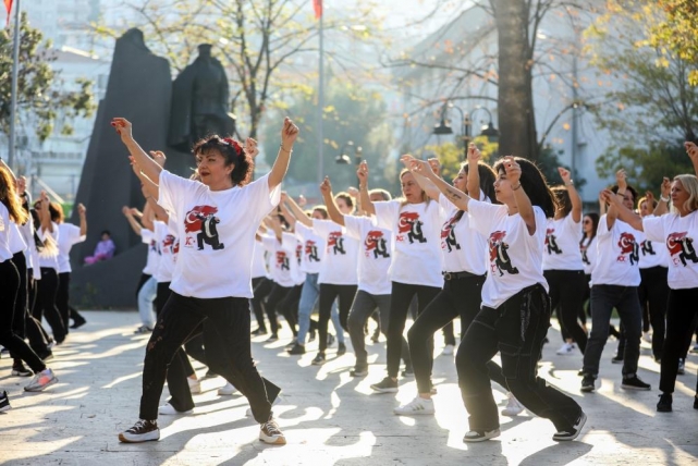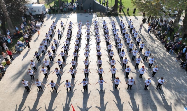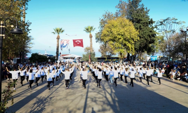 Mudanya Belediyesi Halk Dansları Topluluğu Eğitmeni Kenan Çelik yönetiminde yapılan gösteride, İskele Meydanı’nda bulunan Atatürk heykeli önünde 100 kişi zeybek oynadı.