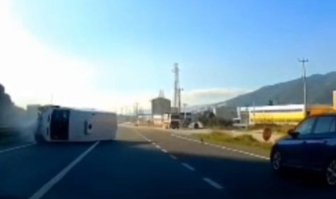 Orta refüje çarpan minibüs, yan yattıktan sonra karşı şeritten gelen araçların önünde durdu. Trafik akışının seyrek olması, büyük bir kazanın önüne geçerken, yaşanan anlar ise saniye saniye araç kamerasına yansıdı.