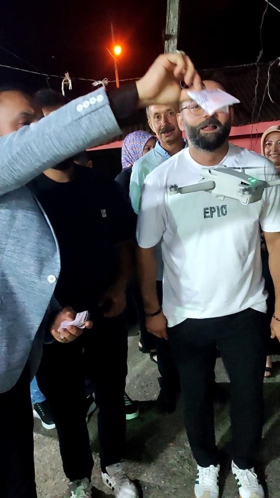 Bursa'da sosyal medyada içerik üreten Soner Aydın(32), memleketi Giresun'da yeğeninin sünnet düğününe gitti. Düğüne dron operatörü arkadaşı ile birlikte giden Aydın, ağabeyinden drona para takmasını söyledi.