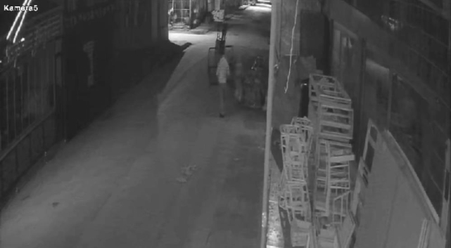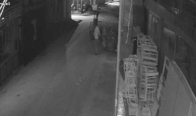 Şüphelilerden biri iş yerinin önünde paketlenen metal bahçe koltuğunu aldı. Demir koltuğu çek çek aracına koyan şahıslar, uzaklaşarak kayıplara karıştı. Hırsızlık anı güvenlik kamerasına saniye saniye yansıdı.