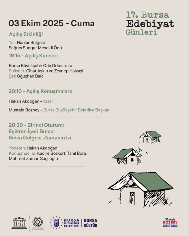 Bursa Edebiyat Günleri, 3 Ekim Cuma Günü saat 19.15’te Hanlar Bölgesi Sağrıcı Sungur Mescidi önünde Büyükşehir Oda Orkestrası’nın vereceği açılış konseri ile başlayacak. Yazar Hakan Akdoğan ve Büyükşehir Belediye Başkanı Mustafa Bozbey’in konuşacağı program, Kadire Bozkurt, Tanıl Bora, Mehmet Zaman Saçlıoğlu’nun konuşmacı olduğu ‘Eşikten İçeri Bursa: Sesin Gölgesi, Zamanın İzi’ adlı oturumla devam edecek.