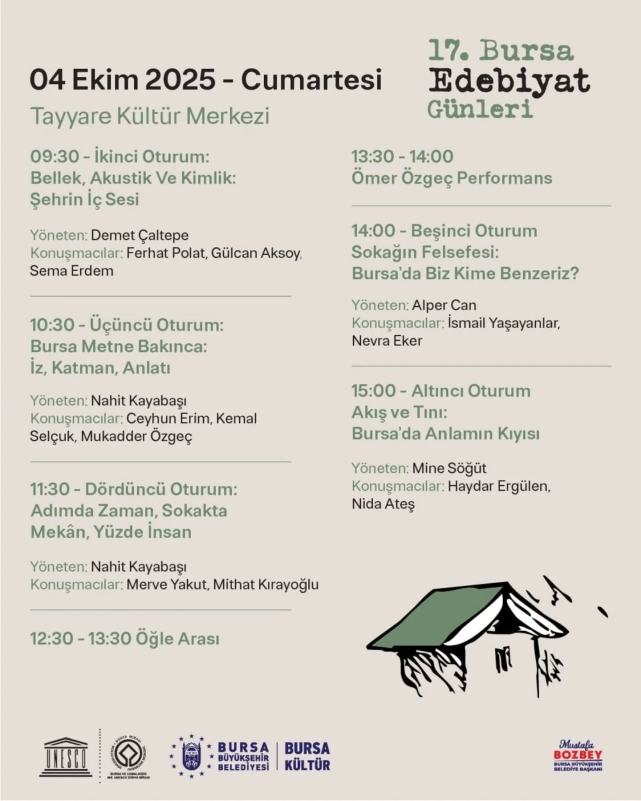 Tayyare Kültür Merkezi’nde devam edecek olan Edebiyat Günleri’nin ikinci gününde de birçok önemli yazarın ve fikir insanının katılımıyla, ‘Bellek, Akustik ve Kimlik: Şehrin İç Sesi’, ‘Bursa Metne Bakınca: İz, Katman, Anlatı’, ‘Adımda Zaman, Sokakta Mekan, Yüzde İnsan’, Sokağın Felsefesi: Bursa’da Biz Kime Benzeriz?’, ‘Akış ve Tını: Bursa’da Anlamın Kıyısı’ konulu oturumlar gerçekleştirilecek.