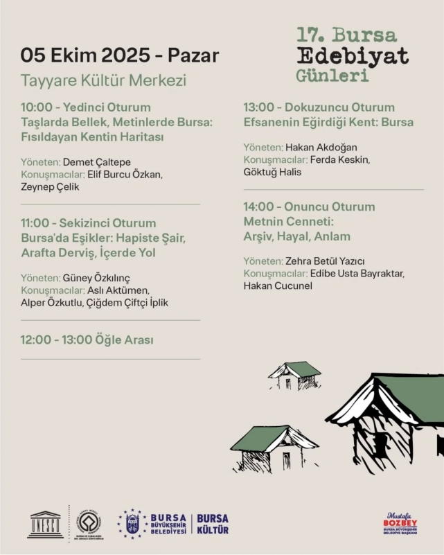 Edebiyat Günleri’nin üçüncü gününde ise 'Taşlarda Bellek', 'Metinler Bursa: Fısıldayan Kentin Haritası', 'Bursa’da Eşikler: Hapiste Şair, Arafta Derviş, İçerde Yol', 'Efsanenin Eğirdiği Kent: Bursa', 'Metnin Cenneti: Arşiv, Hayal, Anlam' konulu oturumlarda yazarlar fikirlerini Bursalılarla paylaşacak.