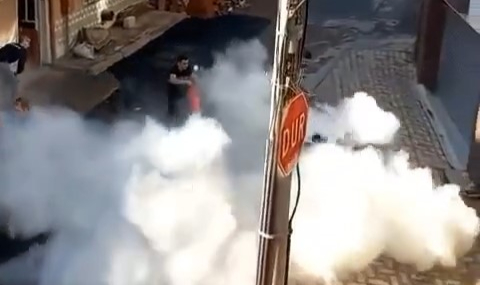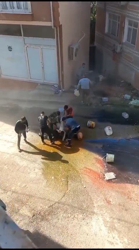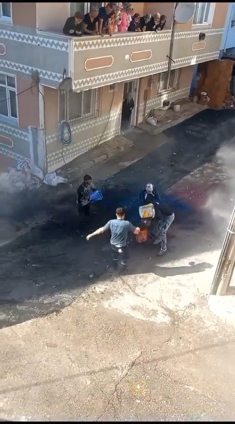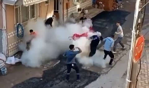 Kız tarafının yakınları tarafından hazırlanan boyalar damat kapıya gelince başından aşağı döküldü. Yangın tüpünü damada sıkan kız tarafı, tozu dumana kattı.