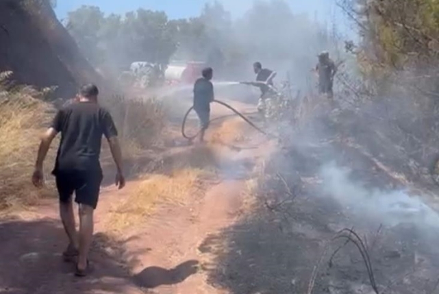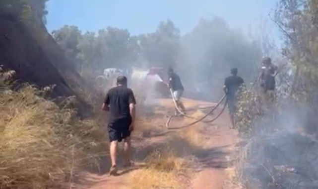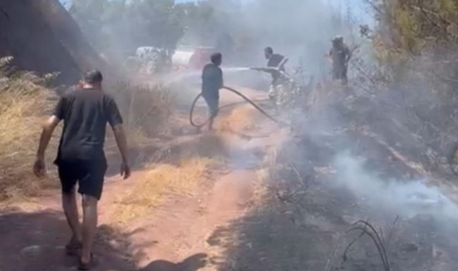 Köylüler, yangının yayılmaması için çevredeki kuru otları temizleyip, su dolu bidonlarla alevlere müdahale etmeye çalıştı.