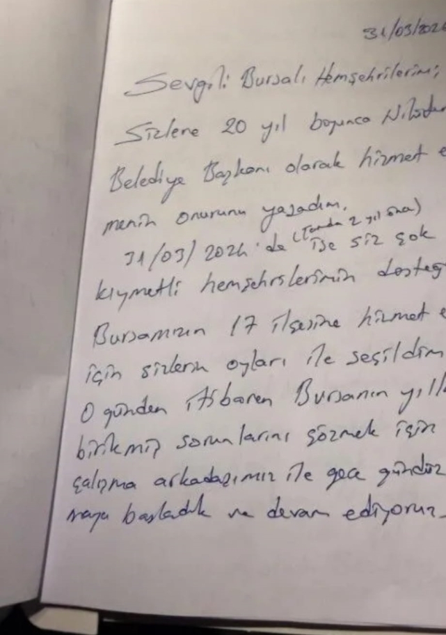 Bozbey mektubunda şu ifadelere yer verdi:Sevgili Bursalı hemşehrilerim;Sizlere 20 yıl boyunca Nilüfer Belediye Başkanı olarak hizmet etmenin onurunu yaşadım. Tam 2 yıl önce 31 Mart 2024’te ise siz çok kıymetli hemşehrilerimin desteği ile Bursa'mızın 17 ilçesine hizmet etmek için sizlerin oyları ile seçildim. O günden itibaren Bursa’nın yıllardır birikmiş sorunlarını çözmek için 15 bin çalışma arkadaşımız ile gece gündüz çalışmaya başladık ve devam ediyoruz.