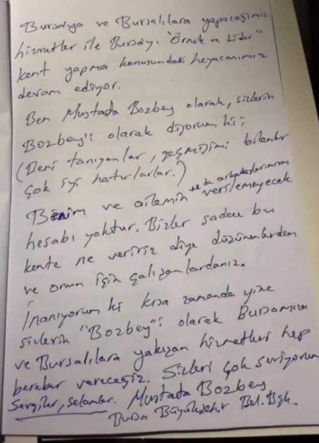 Bursa Büyükşehir Belediye Başkanı Mustafa Bozbey, Bursa Cumhuriyet Başsavcılığı tarafından yürütülen soruşturma kapsamında gözaltına alındı. Olayın ardından Bozbey, kaleme aldığı mektubunu resmi sosyal medya hesabından paylaştı.