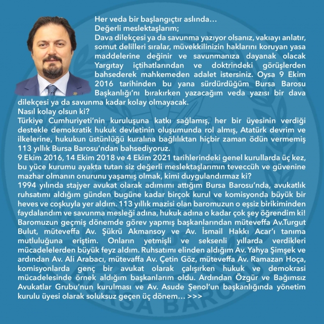 ‘Her veda bir başlangıçtır aslında’ başlığıyla yaptığı paylaşımda Altun, ‘Değerli meslektaşlarım, Bursa Barosu başkanı olarak çalışma arkadaşlarımla birlikte verdiğimiz hukukun üstünlüğü ve savunma mesleğinin kutsallığına halel getirmeme mücadelesine bundan böyle Türkiye Barolar Birliği Başkan Yardımcısı olarak devam edeceğim’ ifadelerini kullandı.