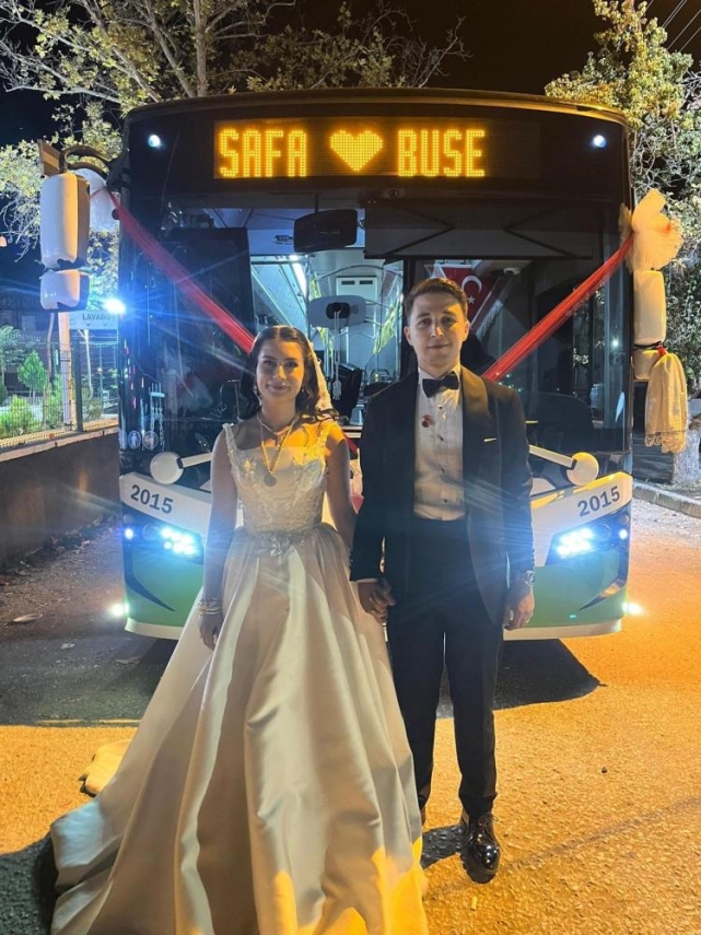 Çiçek ve kurdelelerle donatılan otobüs, konvoydaki diğer araçlarla birlikte klaksonlar eşliğinde ilçe turu attı. Renkli anlar düğüne katılanların cep telefonu kameralarına yansırken, gelin ve damadın mutluluğu yüzlerine yansıdı.