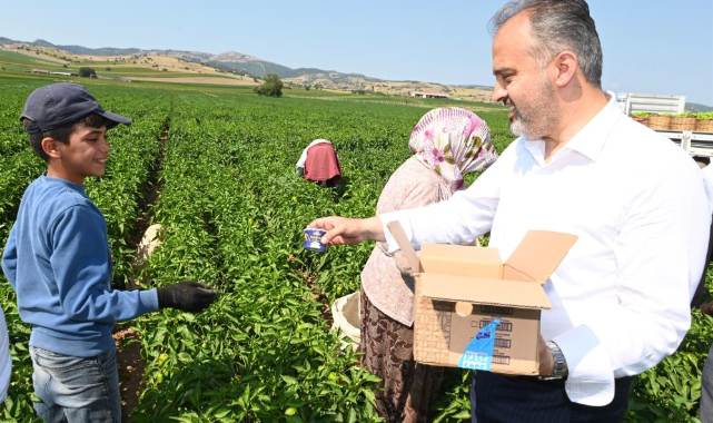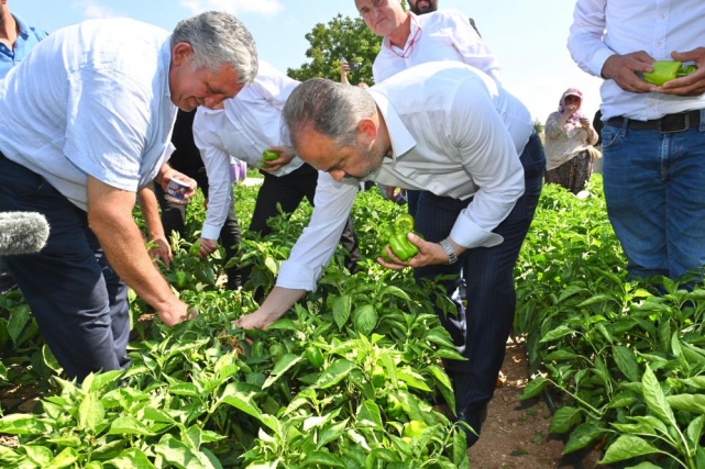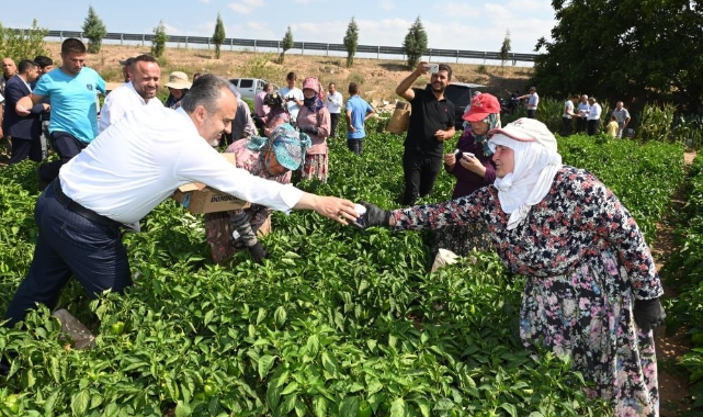 Bursa’da kaliteli tohumluk ve fidan temininden ekipman destekleri ve pazarlamaya kadar üretimin her aşamasında çiftçilerin yanında olan Bursa Büyükşehir Belediye Başkanı Alinur Aktaş, Yenişehir’in Cihadiye Mahallesi’nde biber hasadı yapan çiftçilerle bir araya geldi. Yenişehir Belediye Başkanı Davut Aydın ve Yenişehir Ziraat Odası Başkanı Sadi Aktaş ile birlikte tarlaya giren Başkan Aktaş, hem çiftçilerle sohbet etti hem de onlarla birlikte biber topladı. Sıcaktan bunalan çiftçilere kendi elleriyle dondurma ikram eden Başkan Aktaş, sezonun bereketli ve bol kazançlı geçmesini diledi.