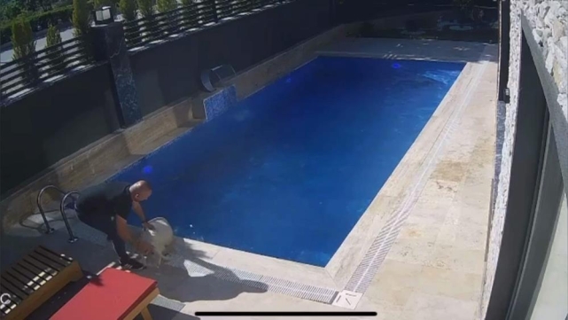 O sırada kurtulan koç, kaçmaya başladı. Bir villanın bahçesine giren koç, havuza atlayarak yüzmeye başladı.