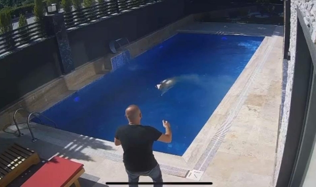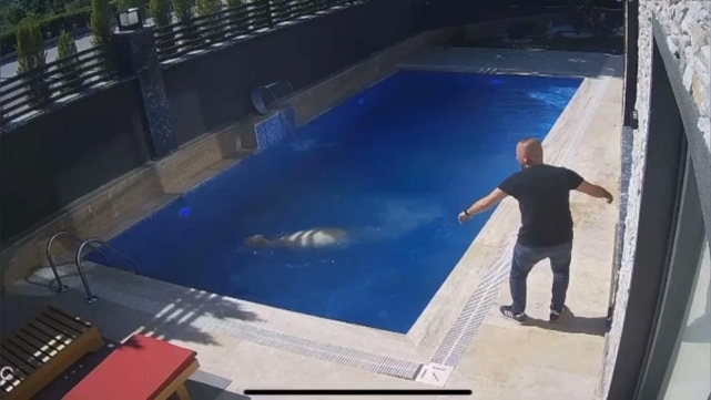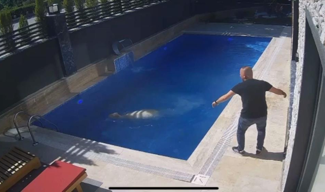 Sedat Kasap, havuza atlayıp kısa süreli yüzdükten sonra havuz kenarına gelen koçu, eliyle dışarı çıkarıp yakaladı.