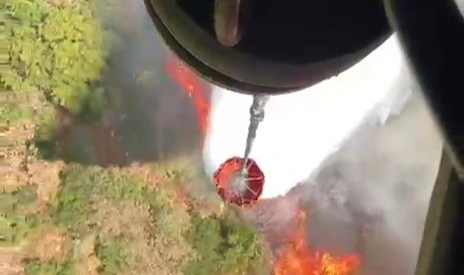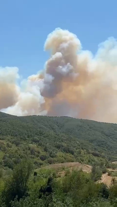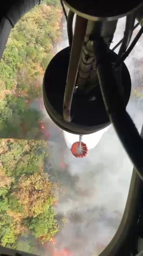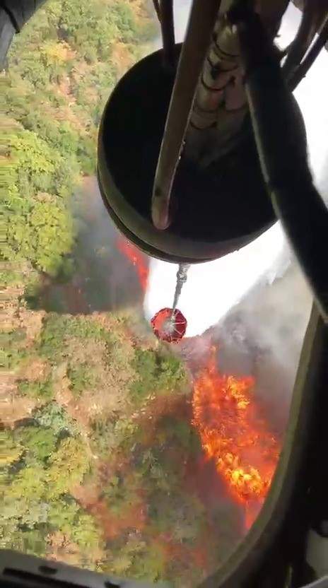 Yangına müdahale eden ekipler, alevlerin yayılmasını önlemek için havadan helikopter desteğiyle su boşaltma çalışmalarını sürdürüyor.