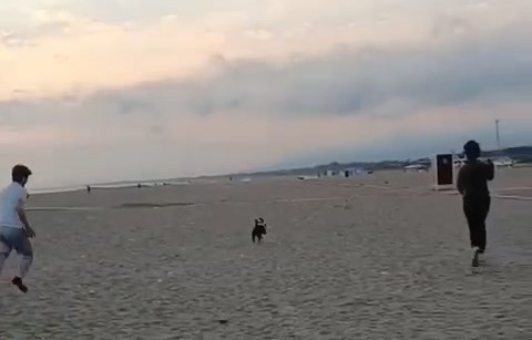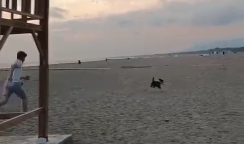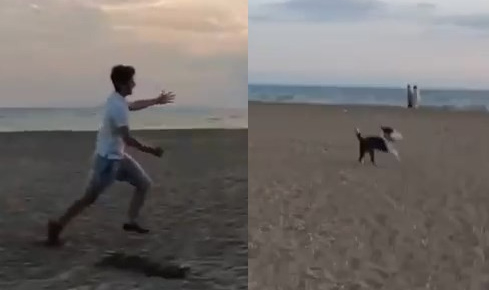Ayakkabıyı kapan köpek hızla koşarken, ayakkabı sahibi de peşinden metrelerce koştu. O anlar ise plajda bulunan başka bir kişinin cep telefonu kamerasına anbean yansıdı.
