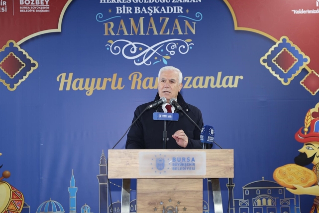 “RAMAZAN’DA HER GÜN 35 BİN VATANDAŞIMIZA ULAŞIYORUZ”Bursa Büyükşehir Belediye Başkanı Mustafa Bozbey, Karacabeylilerle kardeşlik sofrasında buluşmaktan son derece mutlu olduğunu söyledi. Ramazan ayının bereketini ve huzurunu kent genelinde hissettiklerini belirten Başkan Mustafa Bozbey, gönüllerin aynı duada buluştuğunu, lokmaların paylaşıldığını, kardeşliğin pekiştirildiğini dile getirdi. Ramazan ayının dayanışmanın büyüdüğü, iyiliğin çoğaldığı, kalplerin yumuşadığı bir ay olduğunu ifade eden Başkan Mustafa Bozbey, “Soframızda eşitlik, adalet, paylaşma, birlik ve beraberlik vardır. Ramazan ayı boyunca Bursa’nın dört bir yanında hemşehrilerimizle bir araya geliyoruz. Her akşam kardeşlik sofrasını bir ilçede kuruyoruz. 4 sabit iftar noktasında halkımızla buluşuyoruz. İftara yetişemeyenlere iftariyelik ikram ediyoruz. Ramazan ayında her gün ortalama 35 bin vatandaşımıza ulaşmanın mutluluğunu yaşıyoruz” dedi.