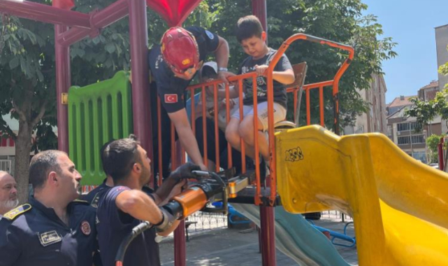Bursa'nın İnegöl ilçesinde karnesini aldıktan sonra arkadaşlarıyla parkta oyun oynarken korkuluklara sıkışan çocuk, mutlu gününde dehşeti yaşadı.