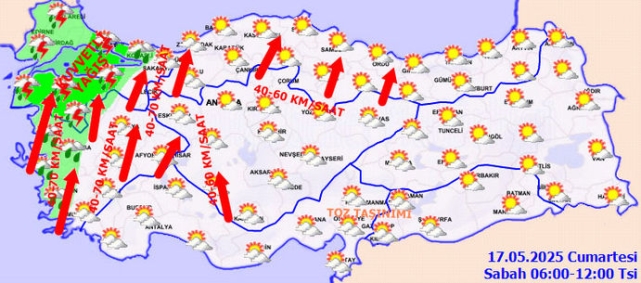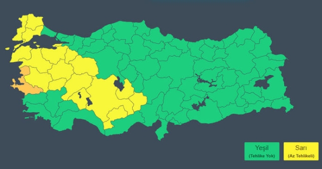 Meteoroloji tarafından "sarı" alarm verilen 19 kentimiz ise şöyle: İzmir (Sarı ve Turuncu), Bursa, Balıkesir, Edirne, Konya, Manisa, Eskişehir, Kütahya, Çanakkale, Bilecik, Afyonkarahisar, Tekirdağ, Aksaray, Yalova, Isparta, Kırklareli, Niğde, Uşak ve Karaman.Rüzgarın genellikle güney yönlerden hafif, ara sıra orta kuvvette, Marmara'nın güneyi, Ege, Akdeniz’in iç kesimleri, İç Anadolu’nun güney kesimleri ile Batı ve Orta Karadeniz’de kuvvetli ve yer yer kısa süreli fırtına (40-70 km/saat) şeklinde esmesi bekleniyor.Habertürk