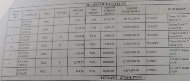 Hepsinin Kayapa Çamlık bölgesinde olan 7 arsa ise şu şekilde sıralanıyor;"8 bin 701 metrekare ticaret imarlı, 4 bin 212 metrekare ticaret imarlı, 4 bin 504 metrekare ticaret imarlı, bin 705 metrekare ticaret imarlı, bin 495 metrekare konut imarlı, bin 379 metrekare konut imarlı ve 985 metrekare konut imarlı. Yaklaşık 20 bin metrekarelik ticaret ve konut imarlı arazilerden tahmini 277 milyon 648 bin 575 lira elde edilecek."