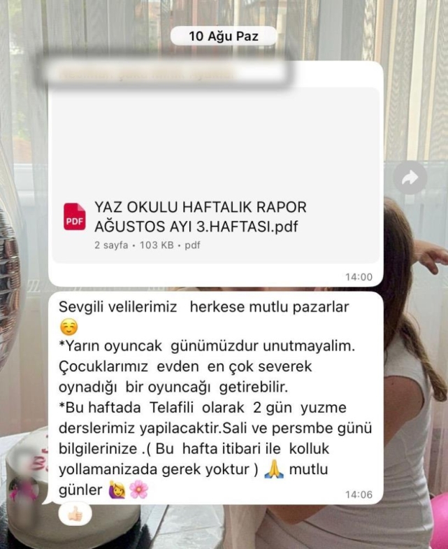 Kızı Berra'nın yüzme bilmediğini ancak buna rağmen okuldaki öğretmeninin veli grubundan mesaj atarak okula kolluksuz gönderilmesini istediğine dikkat çeken Beyza Turan "Berra'yı 3 yaşında kreşe yazdırdık. 1 yıldır kreşe gidiyordu. Okul bitince yaz okuluna gitmeye başladı. Yaz okulunda binicilik, yüzme ve jimnastik gibi etkinliklerin olacağı söylendi. Biz okulla bunun üzerine sözleşme imzaladık. Yüzme öğreteceklerini söylediler. Olaydan 2 gün önce Berra'nın sınıfından bir öğretmen veli grubundan mesaj atıp 12 Ağustos günü okula çocukları kolluksuz göndermemizi istedi. Bunun üzerine o gün kolluklarını yanına vermedik. Ne kolluk ne simit hiç bir şey yoktu çocukta. Daha önce hep kolluk kullanıyordu. Kızım daha suyun üzerinde bile duramıyordu. Kollukları takılı olsaydı bunlar yaşanmayacaktı" diye konuştu.Kaçak havuza faaliyet onayı vermişler