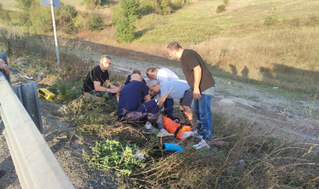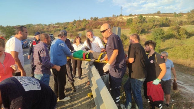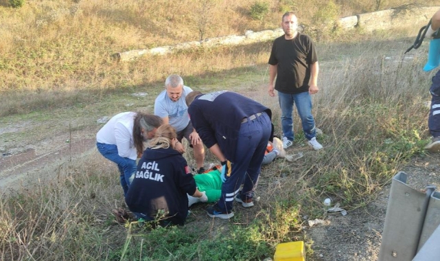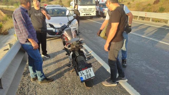Savrulan motosiklet bariyerlere çarptı. Motosiklet üzerinde bulunan sürücü Hakan Y. ile arkasında yolcu olarak bulunan Hülya B. (35) bariyerlerin üzerinden yol kenarına savruldu. Motosiklet ise yolda bir süre başıboş gittikten sonra yol kenarına devrildi.