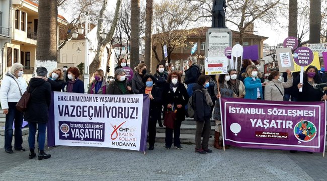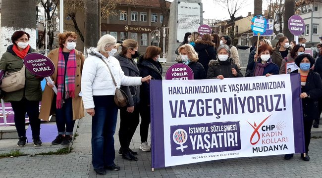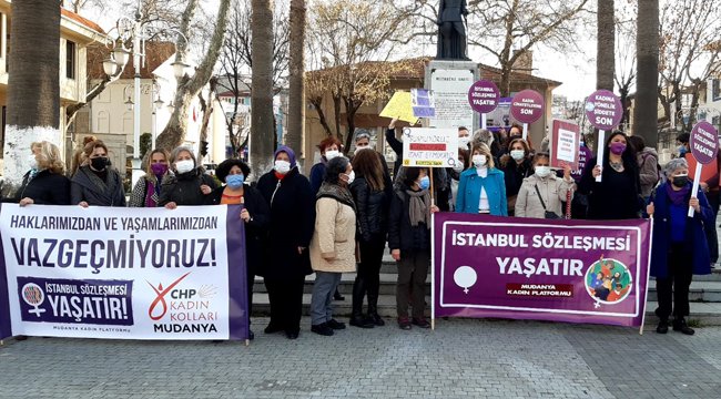 Mudanya Kadın Platformu’nun düzenlediği etkinlikte onlarca kadın bir araya geldi. ‘İstanbul Sözleşmesi Yaşatır’, ‘Hep Birlikte Güçlüyüz’, ‘Vazgeçmiyoruz’ yazılı pankart ve dövizlerle İstanbul Sözleşmesinden çekilme kararına tepkilerini dile getiren kadınlar, hep bir ağızdan ‘Ülkemizin aydınlık yarınları için kazanılmış haklarımızdan vaz geçmiyoruz’ dediler.