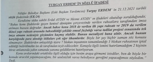 Nilüfer Belediyesi’nde Başkan Bozbey’in yardımcısı olarak görev yapan Turgay Erdem, tek imza ile alınan iskan ve yapı ruhsatlarında bir usulsüzlük varsa, ‘Gözümden kaçmıştır. Mesuliyetini üstlenirim’ savunmasını yaptı.
