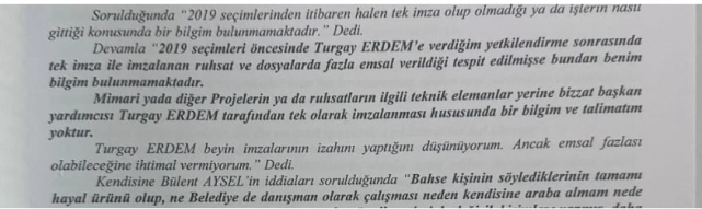 Nilüfer Belediye Başkanı Bozbey ve yardımcısı Turgay Erdem’in emniyetteki ifadeleri çelişki oluşturdu. Eski Başkan Bozbey, 2019 yerel seçim öncesi tek imza yetkisini Erdem’e verdiğini ifade etti. Mimari ya da diğer projelerin ruhsatları ile ilgili teknik elemanlar yerine bizzat başkan yardımcısı Turgay Erdem’in tek olarak imzalaması hususunda bilgisi ya da talimatının olmadığını kaydetti.